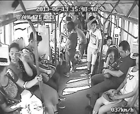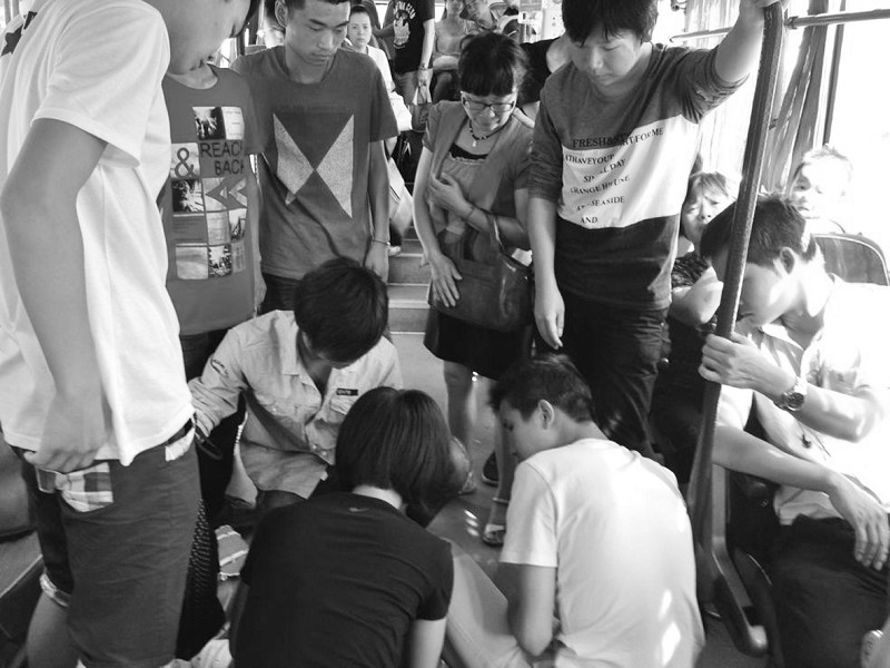 報道詳細還原了發生在6月13日的那一幕:武漢船舶職業技術學院的姚作霖、周雪東、周勇、李峰、羅權、李瀟瀟、文德麟、楊承杰、曹思明等9名同學面試完暑期工回學校途中,在一輛801公交車上突遇一名女性乘客突發癲癇,9名同學立即施救:姚作霖和周雪東將這名女乘客扶住,10秒鐘后,姚作霖跑向駕駛臺通知司機并報警,文德麟等人一起幫忙扶托住女青年,李瀟瀟蹲下來幫女青年擦掉她面部的口水,周雪東則一直專注地掐著女青年的人中,同時,姚作霖用女青年的手機與她的朋友、家人聯系,大家也一直托著這名女青年。在大家的施救下,這名女青年終于醒來,并被隨后到來的救護車送往醫院。