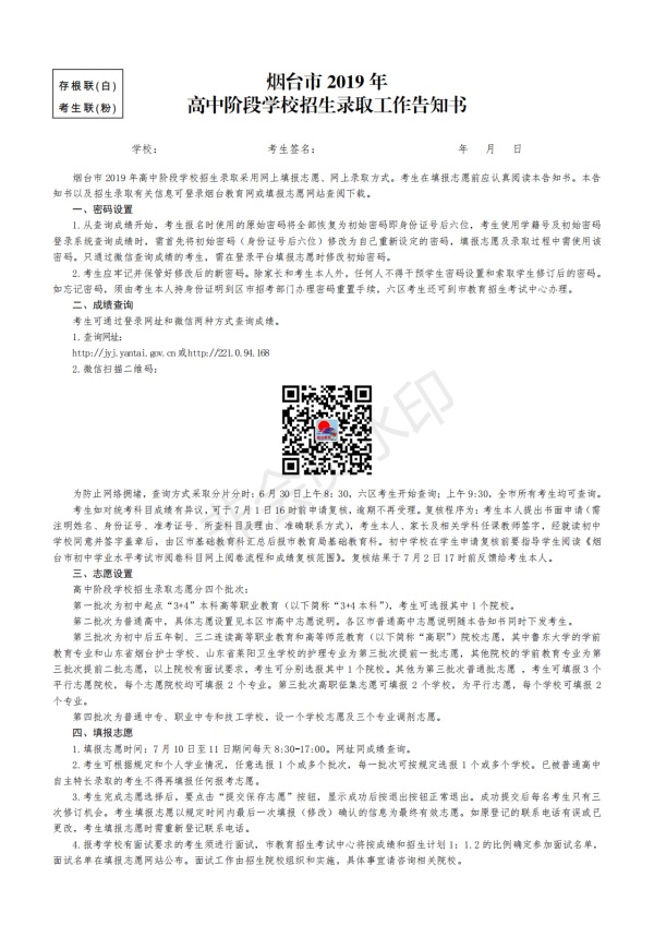 2019年山東煙臺中考普通高中招生錄取告知書公布了,招生錄取時間:7月17日至7月23日。具體內容如下所示: